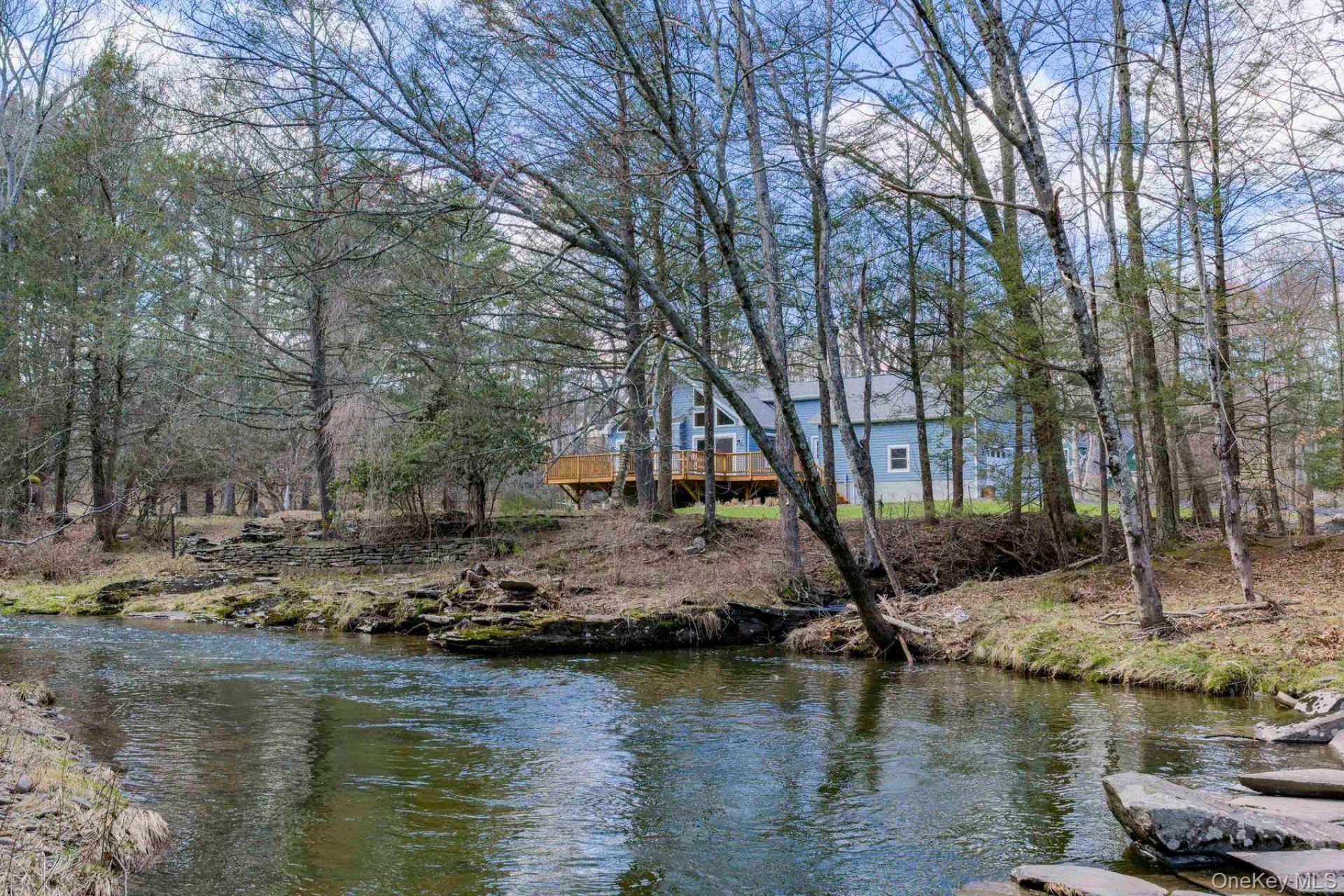Some properties are about the house - this one begins with the water. Sit by the year-round creek for a few minutes and everything slows; it's a setting that quietly draws you in and holds you there.Set on two wooded acres along the Sawkill Creek, and tucked away at the end of long driveway just minutes from the center of Woodstock, the house is positioned to take full advantage of its surroundings - with views to the water from the great room, the expansive rear deck and the upstairs loft. In the warmer months, the creek becomes part of daily life, offering a place to cool down, unwind, or simply sit and take it in, with two swimming holes, including the Big Deep, just moments away.The grounds have been carefully and thoughtfully shaped to complement the setting, with layers of seasonal interest throughout the year - rhododendrons blooming along the upper bank of the creek in spring, a magnolia in soft pink just off the house, and a striking ginkgo that turns a luminous yellow in autumn. Wildflower meadows, ornamental grasses, and perennial herbs bring a more relaxed, natural feel to the landscape, creating a setting that feels both intentional and effortlessly in tune with its surroundings.Inside, the light-filled main living space opens beneath soaring vaulted ceilings, where a full-height stacked stone fireplace rises as the focal point of the room - bringing warmth, texture, and a sense of scale to the otherwise clean, wood-lined interior. Two sets of sliding doors open out to the deck, creating a natural connection to the outdoors; in the warmer months, they can be left open to let in the sound of the creek, so the setting becomes part of the room itself. The great room flows easily into a defined dining area, positioned to take in the same views and connection to the landscape, and continues through to the kitchen, where generous cabinetry, a central island, and ample workspace support both everyday living and entertaining.The layout includes three spacious bedrooms and three full bathrooms, including a primary suite with a spacious, spa-like bath featuring a freestanding soaking tub and separate shower. A guest bedroom on the main level, with its own full bath, offers privacy and comfort for visitors. A practical laundry room provides a natural transition from the outdoors - particularly after a dip in the creek - supporting easy, everyday living, and rounding out the main level.Upstairs, a second living area overlooks the main space below, maintaining a visual connection to the great room while c