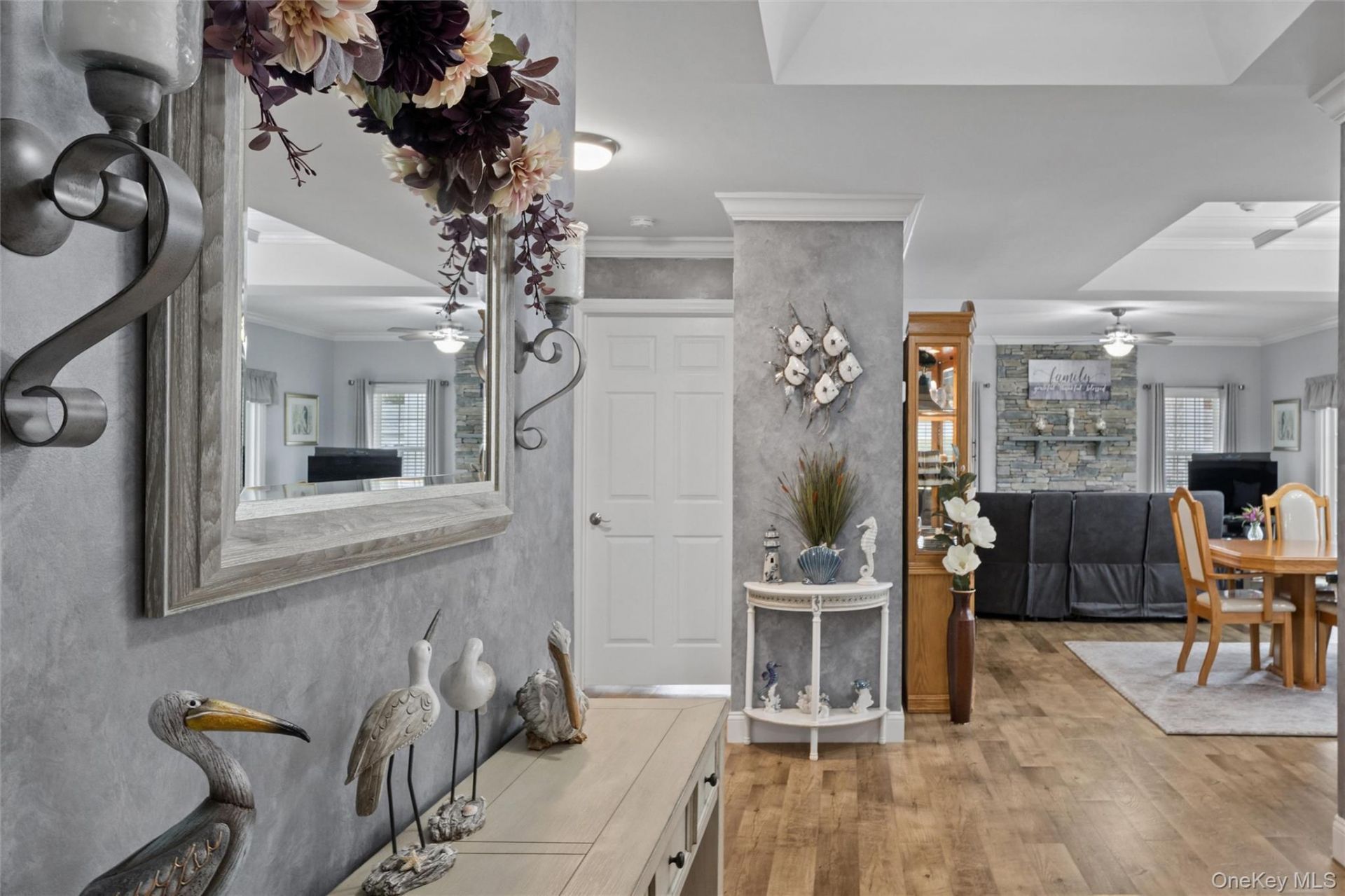 Welcome to The Waterways gated 55+ where resort style living meets the charm of coastal Moriches on Forge river. Experience comfort, elegance, and pond front serenity in this beautifully renovated Edgewater model, ideally situated on the first floor for easy living. This thoughtfully designed home features a spacious, open-concept layout with a stunning kitchen showcasing newer cabinetry and granite countertops; perfect for both everyday living and entertaining.The primary suite offers peaceful pond views with a tranquil water feature, along with a recently renovated en-suite bath. A bright and airy guest bedroom and a second fully updated bathroom with all new fixtures provide comfort and flexibility for visitors.The inviting living room/dining room are centered around a cozy gas fireplace, and sliding doors that lead to your own private patio an ideal spot to unwind and take in the calming pond front scenery. The seamless flow between the kitchen and main living space enhances both functionality and style.Lovingly maintained, this home radiates warmth and pride of ownership throughout. Additional highlights include a one-car garage, central air conditioning, and a convenient roll-out awning for added outdoor comfort.Significant upgrades have been thoughtfully completed in recent years, enhancing both style and efficiency. In 2020, improvements included kitchen cabinetry, the primary bath, vinyl flooring, central air conditioning, furnace, and awning. In 2021, updates continued with the guest bath, windows, sliding glass door, garage door, and garage door opener. The outdoor space was elevated in 2022 with new patio pavers, and in 2023, a new washer and dryer were added-making this home truly move-in ready.Residents of The Waterways enjoy an exceptional array of amenities, including a clubhouse renovated in 2025, private marina on the Forge river, ballroom, heated pool, tennis and pickle ball courts, fitness center, and bocce.Discover why The Waterways is one of the most sought-after 55+ communities; offering a unique blend of beauty, tranquility, and an elevated lifestyle